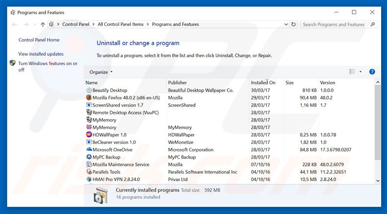 Dans la fenêtre de désinstallation des programmes: recherche tous les programmes potentiellement indésirables, sélectionnez ces entrées et cliquez ''Désinstaller'' ou ''Supprimer''.