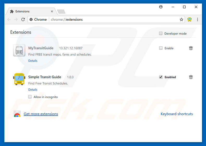 (dans le coin supérieur droit dans Google Chrome), sélectionnez "Plus d'Outils" et cliquez sur "Extensions". Trouver les ajoutes de navigateur suspectes récemment installées sélectionnez ces entrées et cliquez sur l'icône de la corbeille.