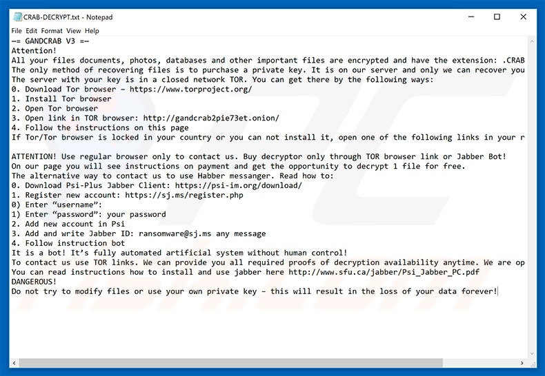 Récemment découvert par le chercheur en sécurité des logiciels malveillants, Marcelo Rivero, GANDCRAB 3 est une nouvelle variante du rançongiciel à haut risque appelée GANDCRAB V2.0. Après une infiltration réussie du système, GANDCRAB 3 encrypte la plupart des fichiers stockés et ajoute l'extension ".CRAB" aux noms des fichiers. Par exemple, " sample.jpg" est renommé " sample.jpg.CRAB ". Les données compromises deviennent inutilisables. Une fois le cryptage terminé, GANDCRAB 3 crée un fichier texte ("CRAB-DECRYPT.txt ") et place une copie dans chaque dossier existant. Ces fonctions sont héritées d'une version antérieure de GANDCRAB 3. Cependant, contrairement aux versions précédentes, GANDCRAB 3 modifie également le fond d'écran du bureau.