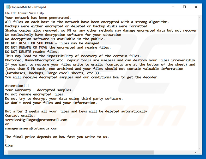 En règle générale, les cybercriminels déclarent que les fichiers des victimes sont cryptés et que seuls eux seuls sont capables de les restaurer. Malheureusement, c'est vrai. Il n'est actuellement pas confirmé si Clop utilise la cryptographie symétrique ou asymétrique. Dans les deux cas, cependant, chaque victime reçoit une clé de déchiffrement unique qui est nécessaire pour restaurer les données. Le problème est que toutes les clés sont stockées sur un serveur distant contrôlé par des cybercriminels. Par conséquent, pour recevoir la clé de décryptage (ou un décrypteur avec la clé intégrée), chaque victime doit payer une rançon. Pour ce faire, les victimes doivent d'abord contacter les cybercriminels via l'une des adresses électroniques fournies. Le prix n'est pas spécifié dans le fichier texte - tous les détails sont fournis par courriel, parce que cela dépend supposément de la rapidité avec laquelle la victime décide de contacter ces personnes. Néanmoins, il convient de mentionner que dans la plupart des cas, les prix fluctuent entre 500 $ et 1 500 $ en bitcoins, éthéréum, monero, DASH ou autre cryptomonnaie. Les victimes sont également autorisées à joindre quelques fichiers sélectionnés (jusqu'à 5 Mo au total qui ne peuvent pas contenir d'"informations utiles") qui seront décryptés et renvoyés pour la victime afin de garantir que les cybercriminels peuvent réellement être fiables. Cependant, peu importe que le prix soit bas ou élevé, vous ne devriez jamais accepter de payer. Les résultats de la recherche montrent que la grande majorité des développeurs de logiciels de rançon ignorent les victimes, une fois que les paiements sont soumis. Pour cette raison, nous vous recommandons fortement de ne pas tenir compte de tous les encouragements, de contacter ces personnes et de payer des rançons. Malheureusement, il n'existe pas d'outils capables de déchiffrer le cryptage de Clop et de restaurer les données gratuitement. La seule solution possible est de tout restaurer à partir d'une sauvegarde.