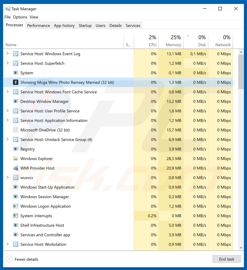 Capture d'écran du processus de demande de rançon de Sodinokibi dans Task Manager ("Showing Mcga Wmv Photo Ramsey Married")