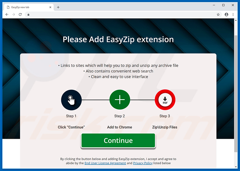 Comme mentionné ci-dessus, easyziptab.com est promu en utilisant le pirate de navigateur EazyZip. Ce programme potentiellement indésirable (PUP) dispose d'un site de téléchargement officiel, mais les criminels le font proliférer également en utilisant le "malvertising" (publicité intrusive) et une méthode de marketing trompeuse appelée "bundling" (installation furtive d'applications malhonnêtes avec des logiciels réguliers [principalement gratuits]). Les développeurs dissimulent les applications "groupées" dans les paramètres "Personnalisé/Avancé" des processus de téléchargement/installation - ils ne divulguent pas ces informations correctement. De plus, les utilisateurs précipitent souvent ces procédures et sautent des étapes. De plus, ils cliquent sur des annonces/liens douteux sans en comprendre les conséquences possibles. Ce faisant, ils exposent leurs systèmes à divers risques d'infection et compromettent leur vie privée.