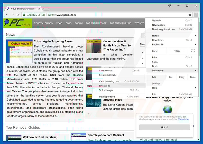 (en haut à droite de Google Chrome), sélectionnez "Plus d’outils" et cliquez sur "Extensions". Localisez tous les add-ons de navigateurs suspects récemment installés et supprimez-les.
