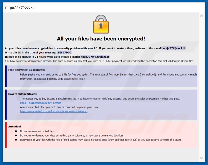 Le fichier texte contient un message indiquant que toutes les données de l'utilisateur ont été verrouillées et que s'il souhaite les récupérer, il doit écrire aux développeurs de Ninja. La fenêtre pop-up est une demande de rançon plus détaillée. Il informe les victimes du cryptage et leur indique que si elles souhaitent décrypter leurs données, elles doivent utiliser les adresses électroniques indiquées. Si les cybercriminels ne répondent pas dans les 24 heures, une autre adresse électronique est fournie. La lettre de l'utilisateur doit contenir son ID (écrit dans le nom de fichier de chaque fichier crypté et dans le message du pop-up) dans le champ titre/sujet. Le prix des outils/logiciels de décryptage (rançon) n'est pas indiqué, mais il dépendra vraisemblablement de la rapidité avec laquelle la victime prend contact. La cryptomonnaie bitcoin est la monnaie dans laquelle les criminels exigent que le paiement soit effectué. A cet effet, il existe des liens qui donnent des instructions sur la façon d'acquérir des Bitcoins. Une fois la rançon payée, on promet à l'utilisateur des outils de décryptage, qui vont restaurer ses données. Comme preuve que la récupération des données est possible, le décryptage gratuit d'un fichier est offert. Ce fichier de test ne doit pas dépasser 1Mo et ne doit contenir aucune information de valeur (ex : base de données, sauvegarde, grande feuille excel, etc.). La note se termine par des avertissements. Ils avertissent la victime que le renommage des fichiers cryptés et la tentative de décryptage manuel avec un logiciel tiers entraîneront une perte de données permanente. Malheureusement, il est vrai que dans la plupart des cas d'infections par rançon, le décryptage manuel est impossible. Généralement, seul le programme utilisé pour crypter les fichiers - peut les décrypter. Malgré cela, il est fortement déconseillé de communiquer avec les cybercriminels ou de répondre à leurs demandes. Souvent, même si les victimes paient, elles ne reçoivent pas les outils/logiciels nécessaires et leurs données restent essentiellement sans valeur. Bien que la suppression de Ninja ne restaurera pas les fichiers affectés, la suppression l'empêchera de procéder à d'autres cryptages. La seule solution possible est de récupérer les données à partir d'une sauvegarde, si celle-ci a été effectuée avant l'attaque et a été stockée séparément.