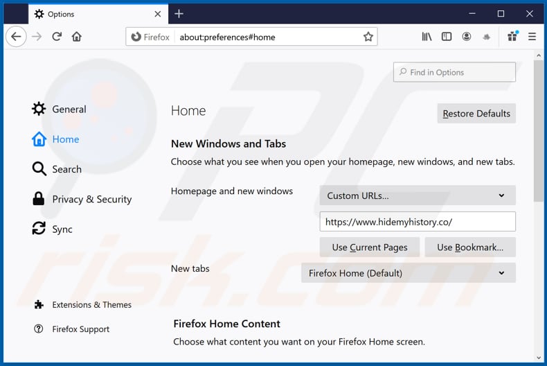 - ETAPE 4. Supprimer la page d'accueil hidemyhistory.co et le moteur de recherche par défaut de Mozilla Firefox.