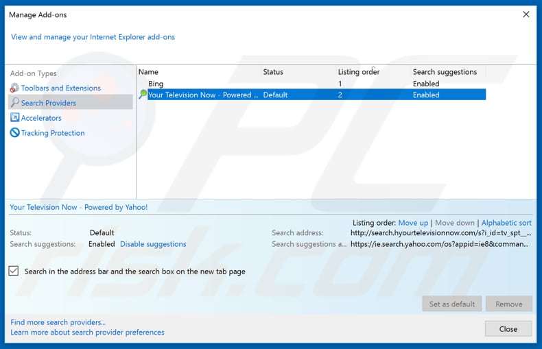 (en haut à droite d'Internet Explorer), sélectionnez "Gérer les add-ons". Dans la fenêtre qui s'ouvre, sélectionnez "Recherche Fournisseurs", définissez "Google", "Bing", ou tout autre moteur de recherche préféré par défaut, puis supprimez "Hide My History" (et "Your Search Tool").