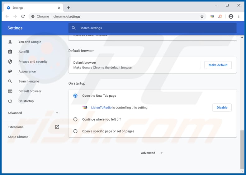 (en haut à droite de Google Chrome), sélectionnez "Paramètres". Dans la section "Au démarrage", désactivez "ListenToRadio", recherchez l'URL d'un pirate de navigateur (hxxp://www.blpsearch.com) sous l'option "Ouvrir une page spécifique ou un ensemble de pages". Si présent, cliquez sur l'icône des trois points verticaux et sélectionnez "Supprimer".